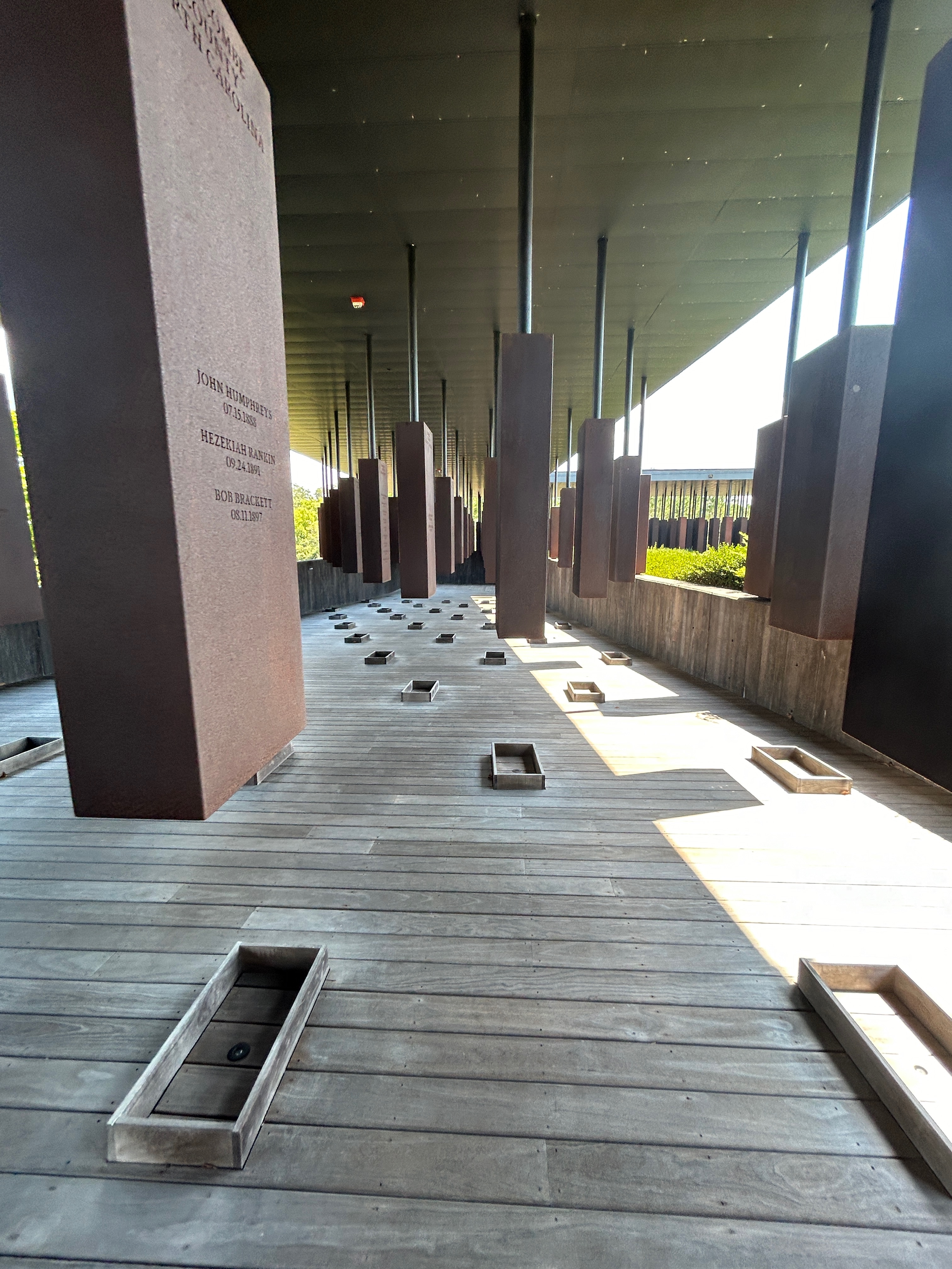 Until you reach these Corten steel pillars, each representing bodies that were lynched from different counties and parishes from different states.